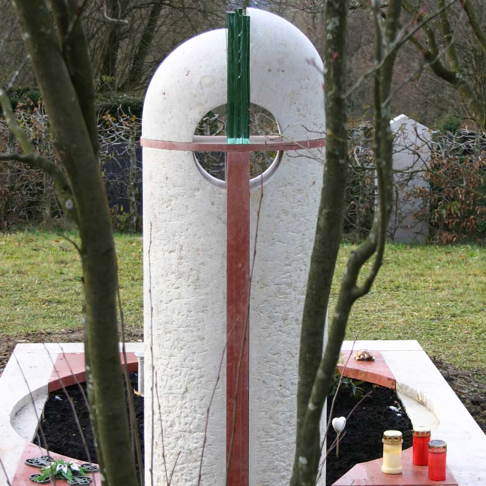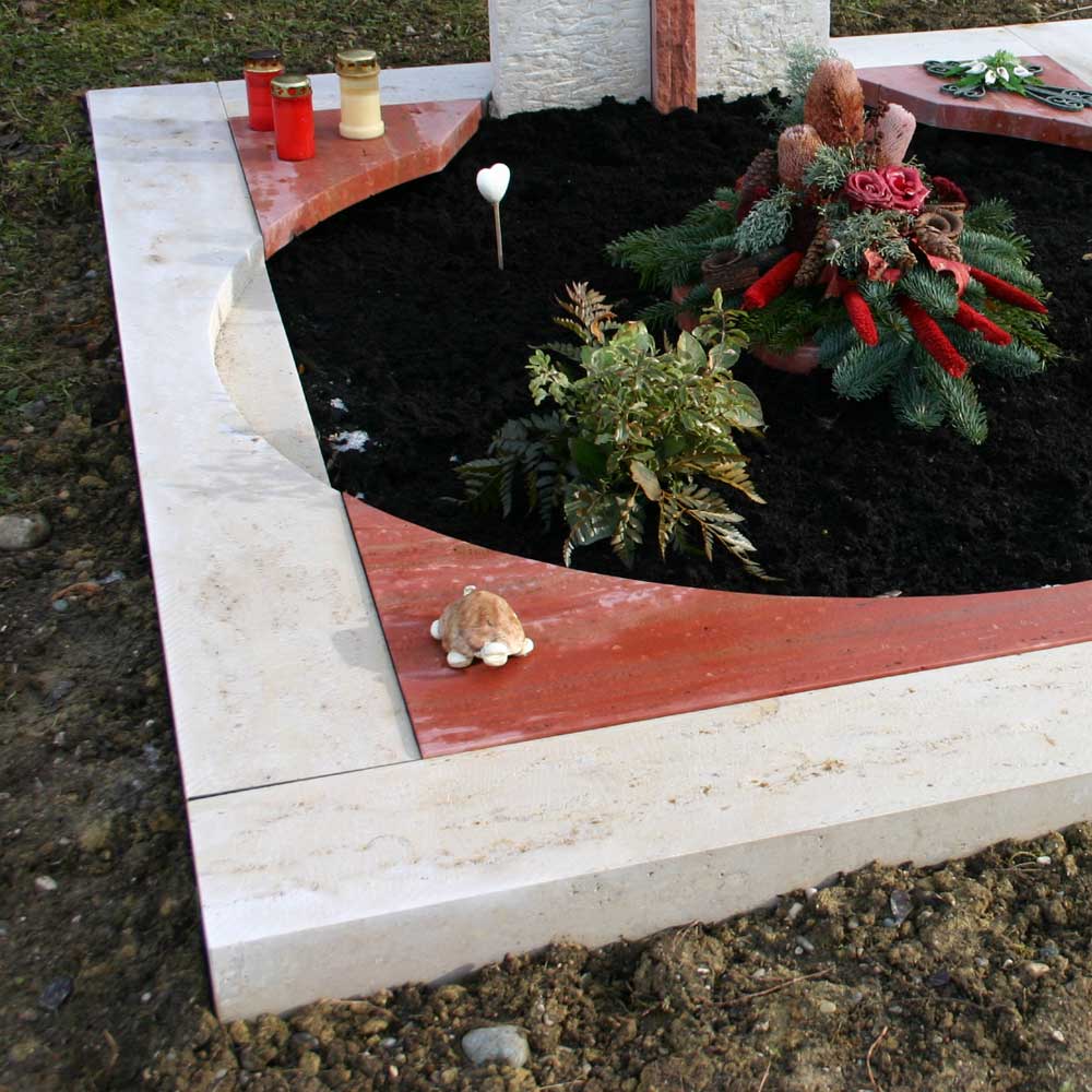 Einfassung geschlossen mit teilweiser Abdeckung. Die Abdeckplatten ergänzen sich zu einem Kreis und wiederholen damit die Kreisform im Zentrum des Kreuzes am Stein.