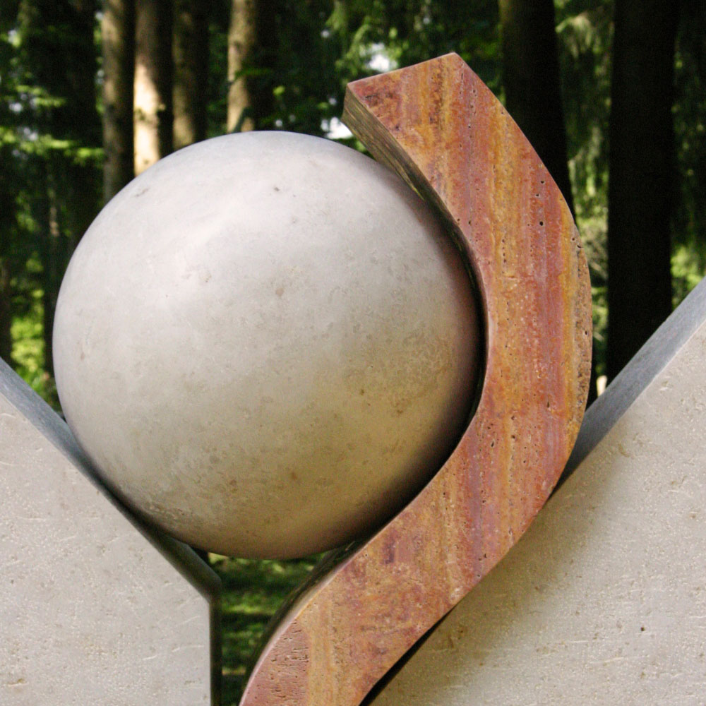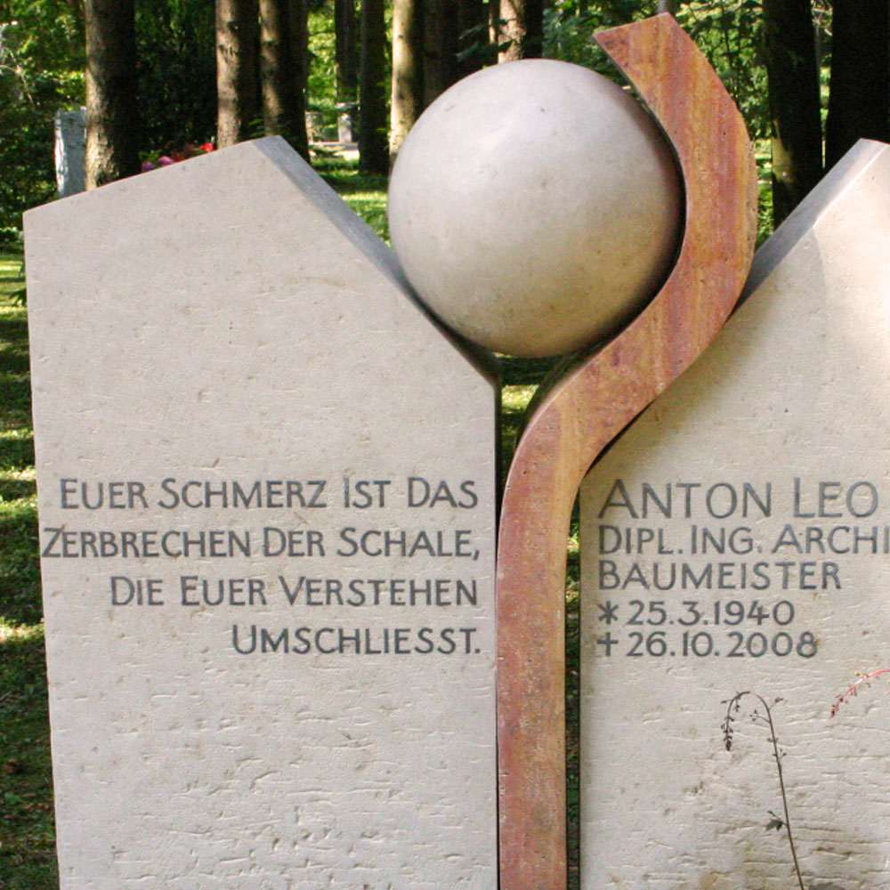 Gestaltung Der Stein zeigt, wie sich die Seele eines Menschen – symbolisiert durch die vollkommene Form der Kugel – langsam aus dem Schutz des Irdischen löst und frei aufsteigen kann. Der Grabstein ist dynamisch von unten rau bis oben fein handwerklich bearbeitet.