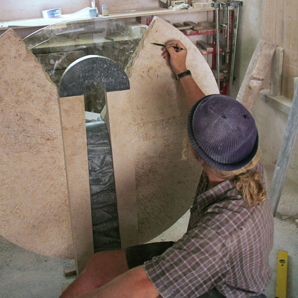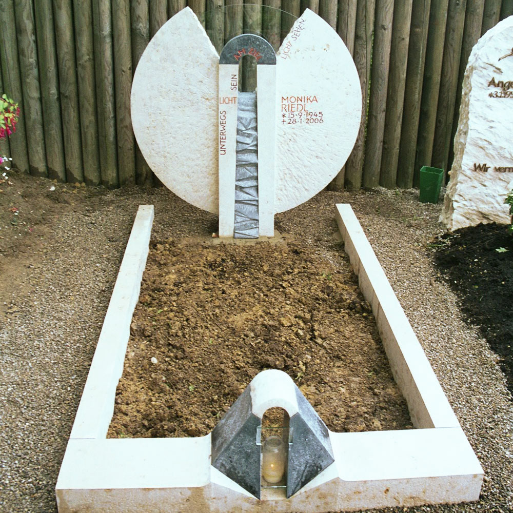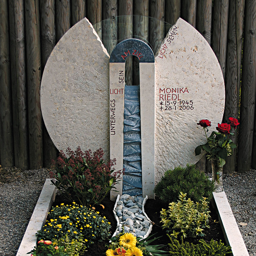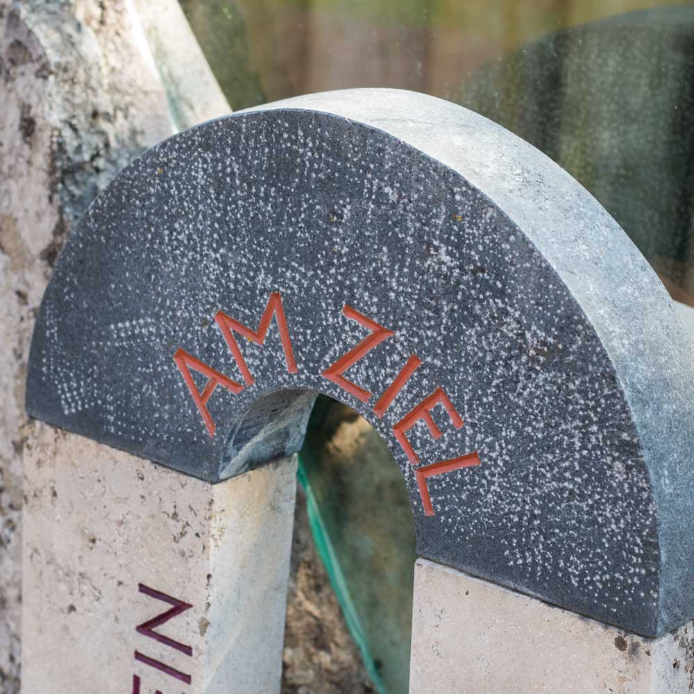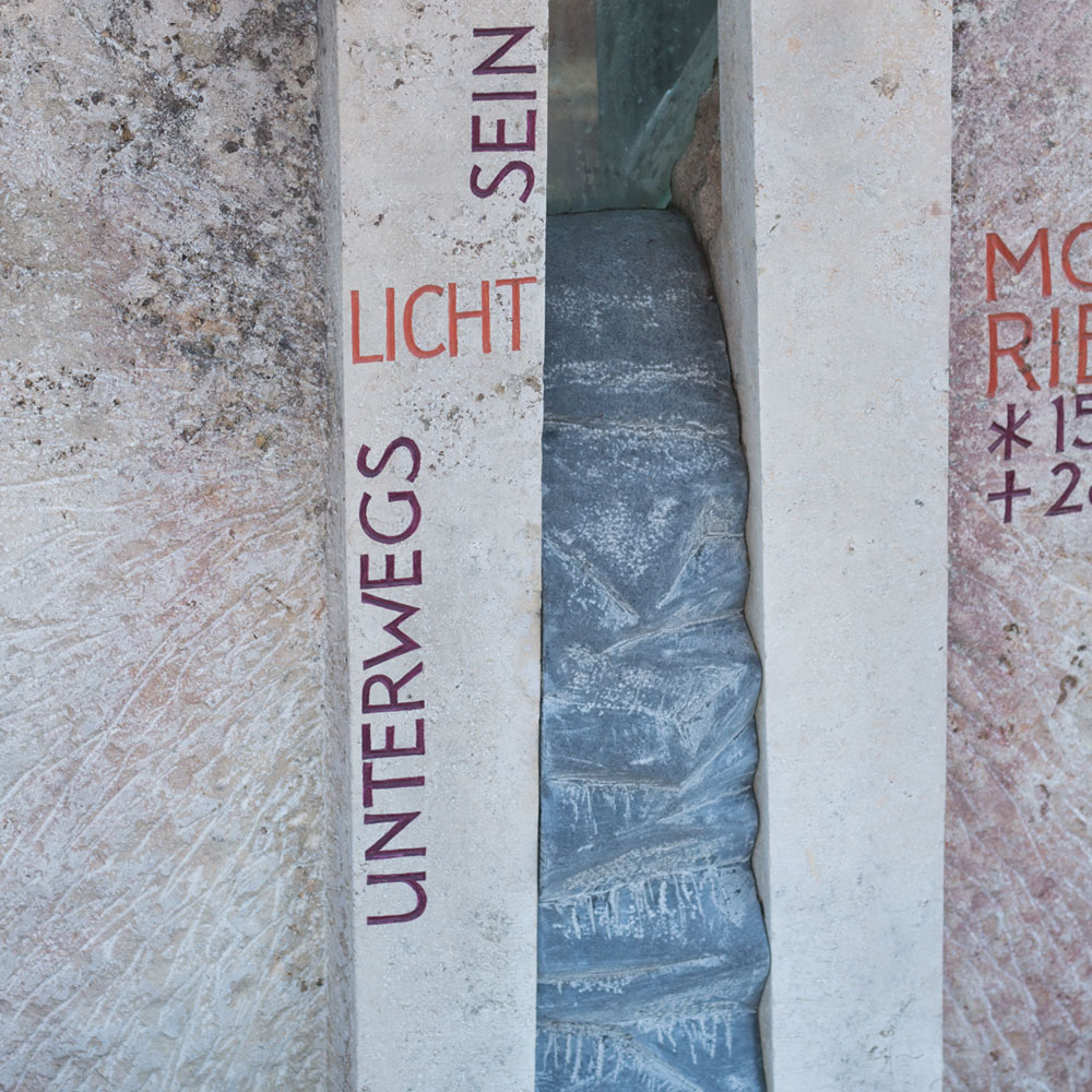 Gestaltung Der dunkle Stein zeigt den Lebensweg mit all seinen Umwegen, Veränderungen und Unwägbarkeiten (Faltung), doch immer stringent. Er führt durch ein Tor – den Tod – ins Licht. Zu diesem Stein gibt es eine dokumentierte Entstehungsgeschichte, siehe Bilder.