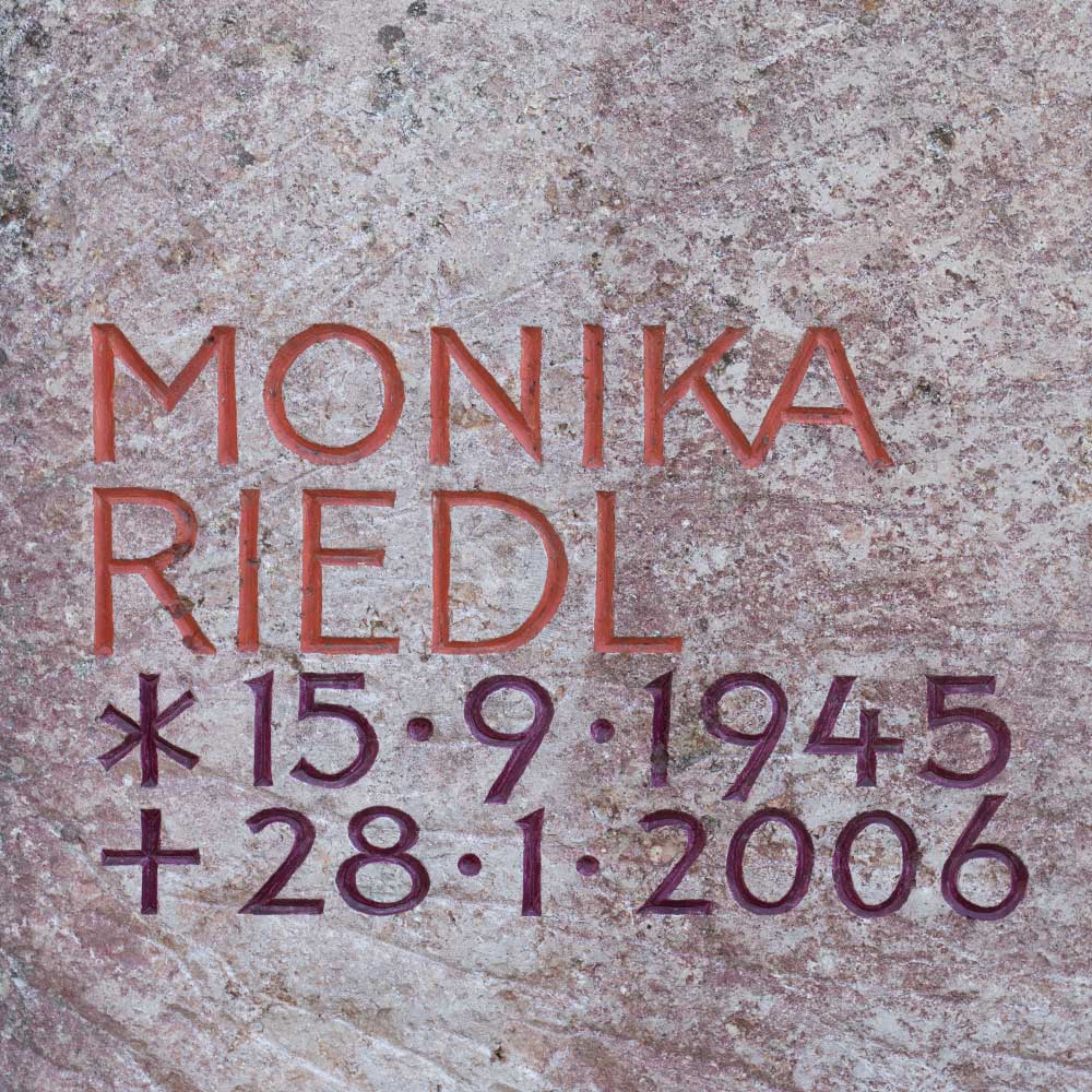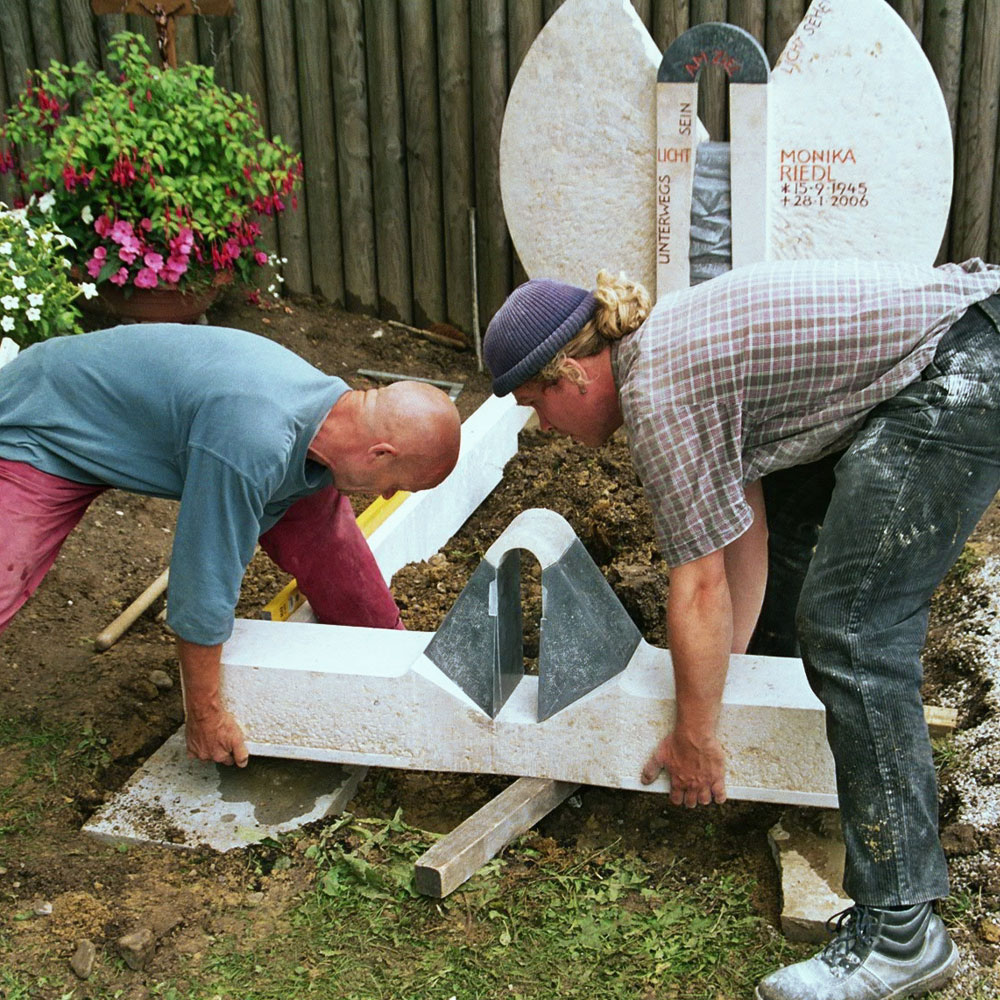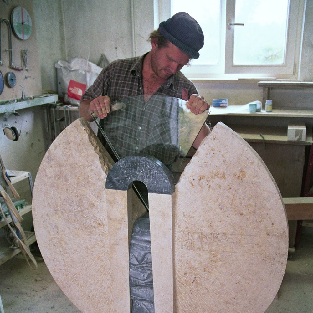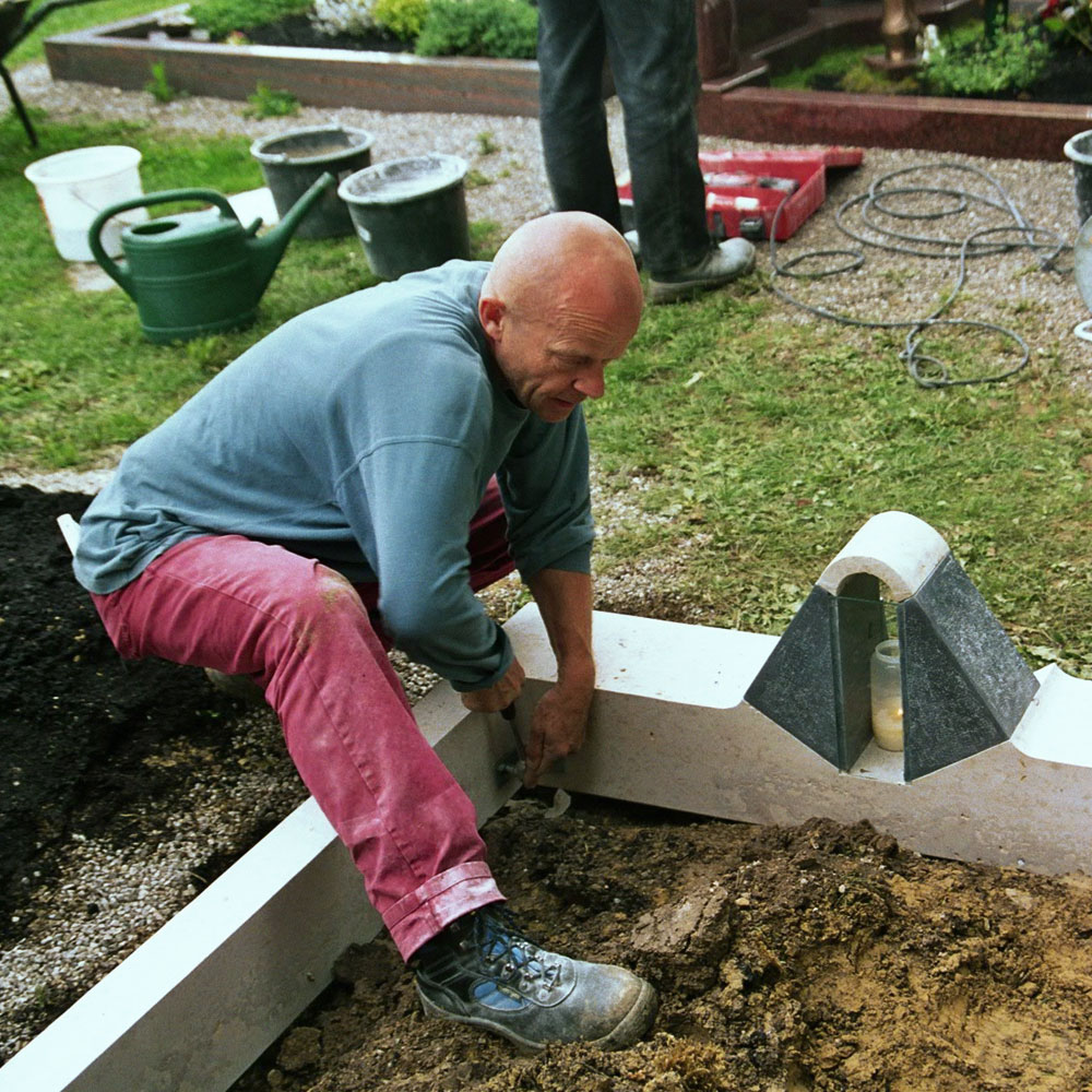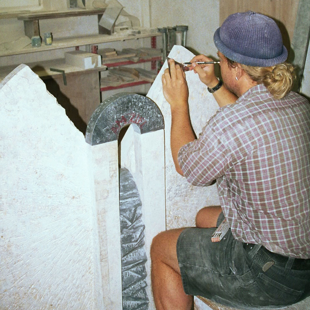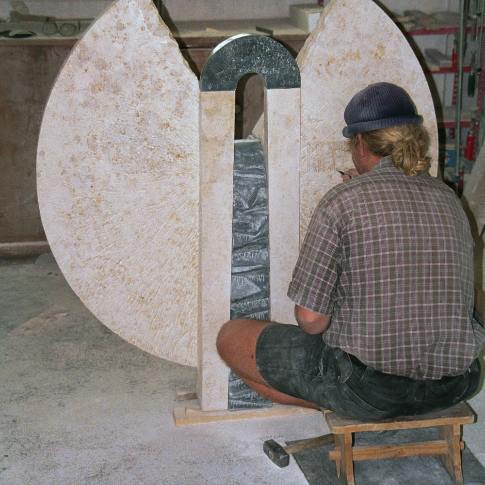 Gestaltung Der dunkle Stein zeigt den Lebensweg mit all seinen Umwegen, Veränderungen und Unwägbarkeiten (Faltung), doch immer stringent. Er führt durch ein Tor – den Tod – ins Licht. Zu diesem Stein gibt es eine dokumentierte Entstehungsgeschichte, siehe Bilder.