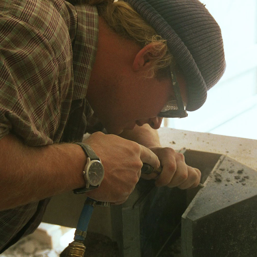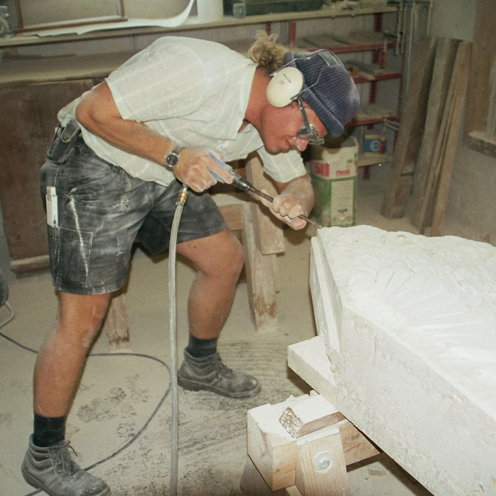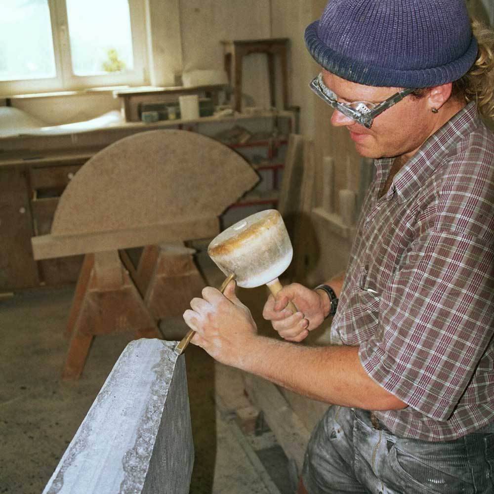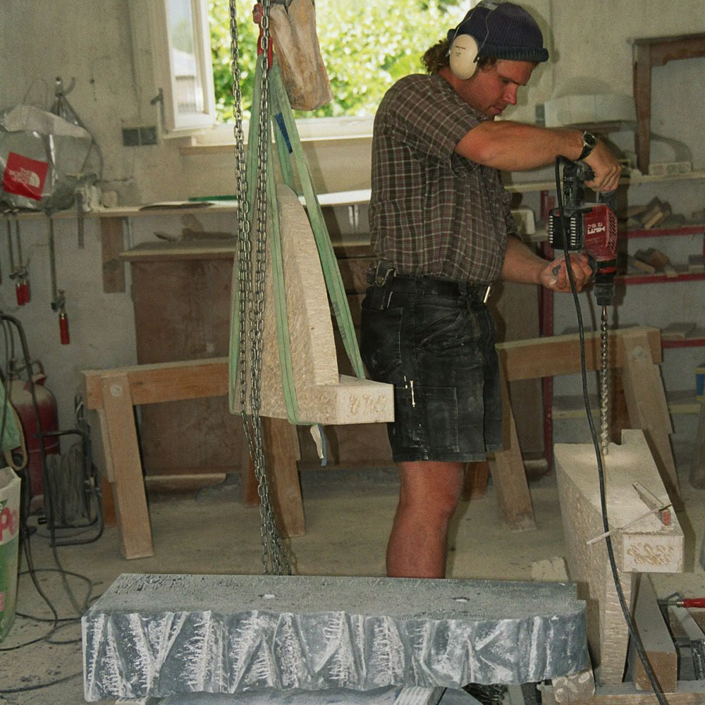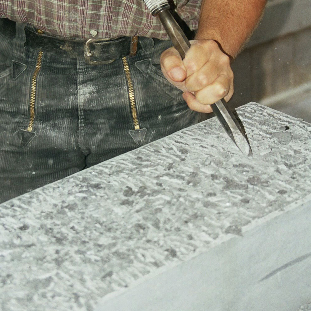 Gestaltung Der dunkle Stein zeigt den Lebensweg mit all seinen Umwegen, Veränderungen und Unwägbarkeiten (Faltung), doch immer stringent. Er führt durch ein Tor – den Tod – ins Licht. Zu diesem Stein gibt es eine dokumentierte Entstehungsgeschichte, siehe Bilder.