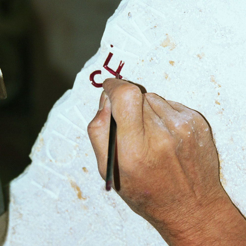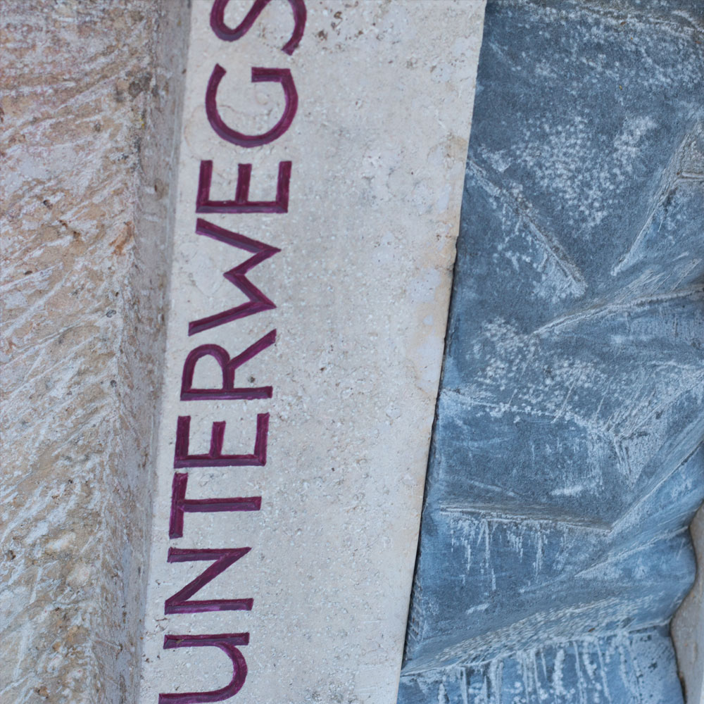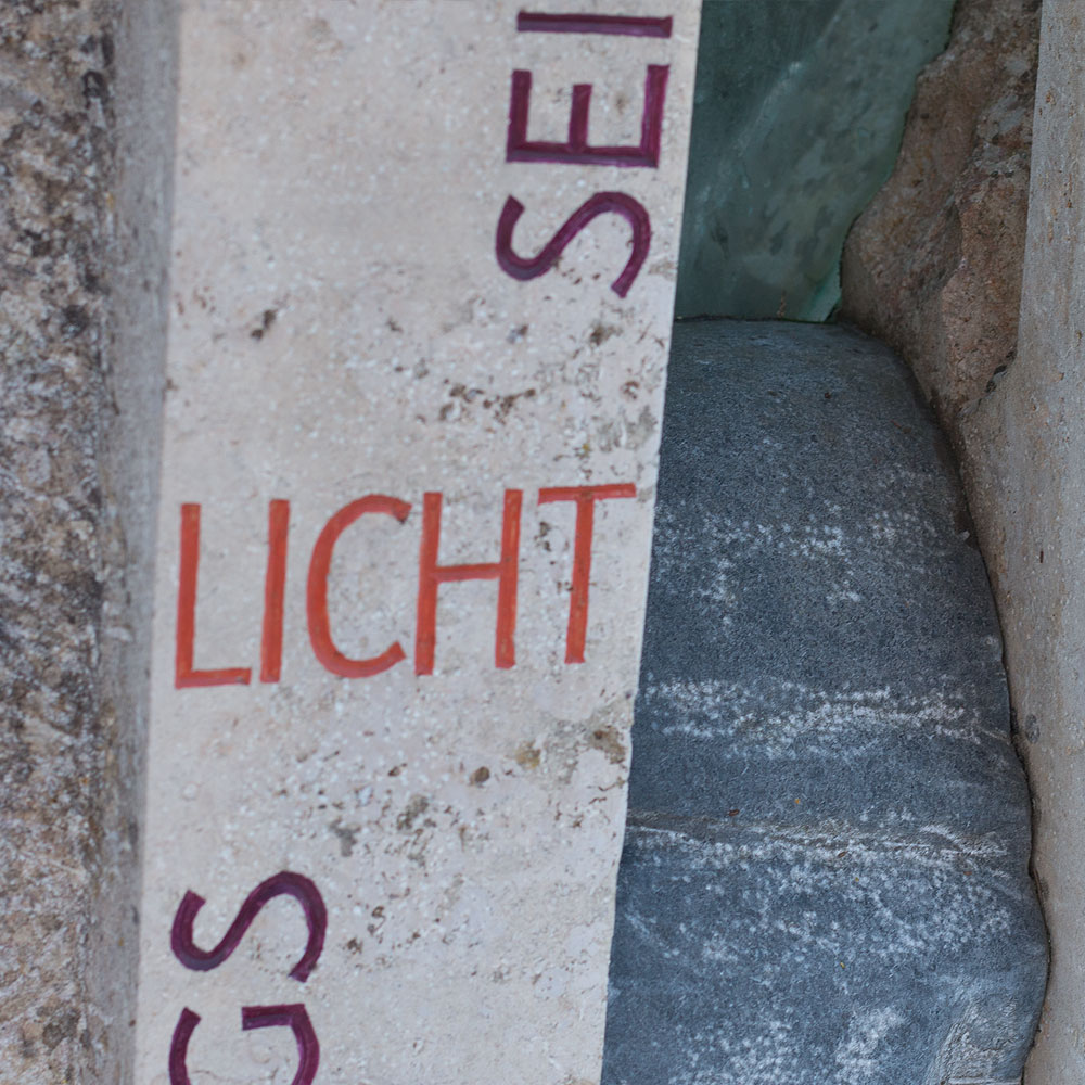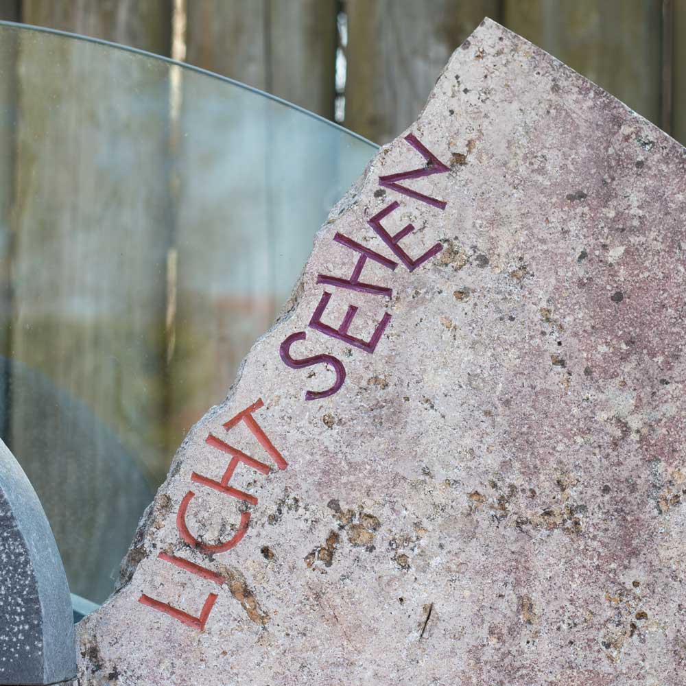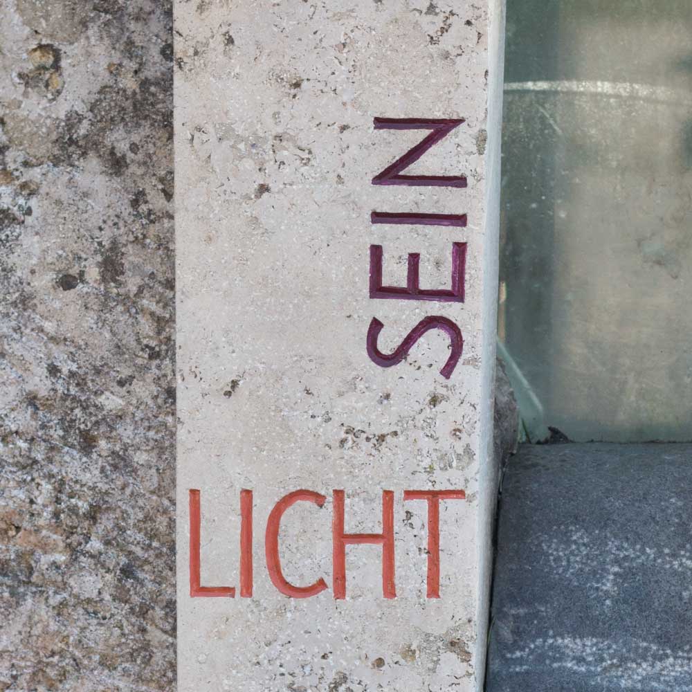 Inschrift “Unterwegs Licht sein am Ziel Licht sehen”, Zeichen graviert getönt in zwei Farben